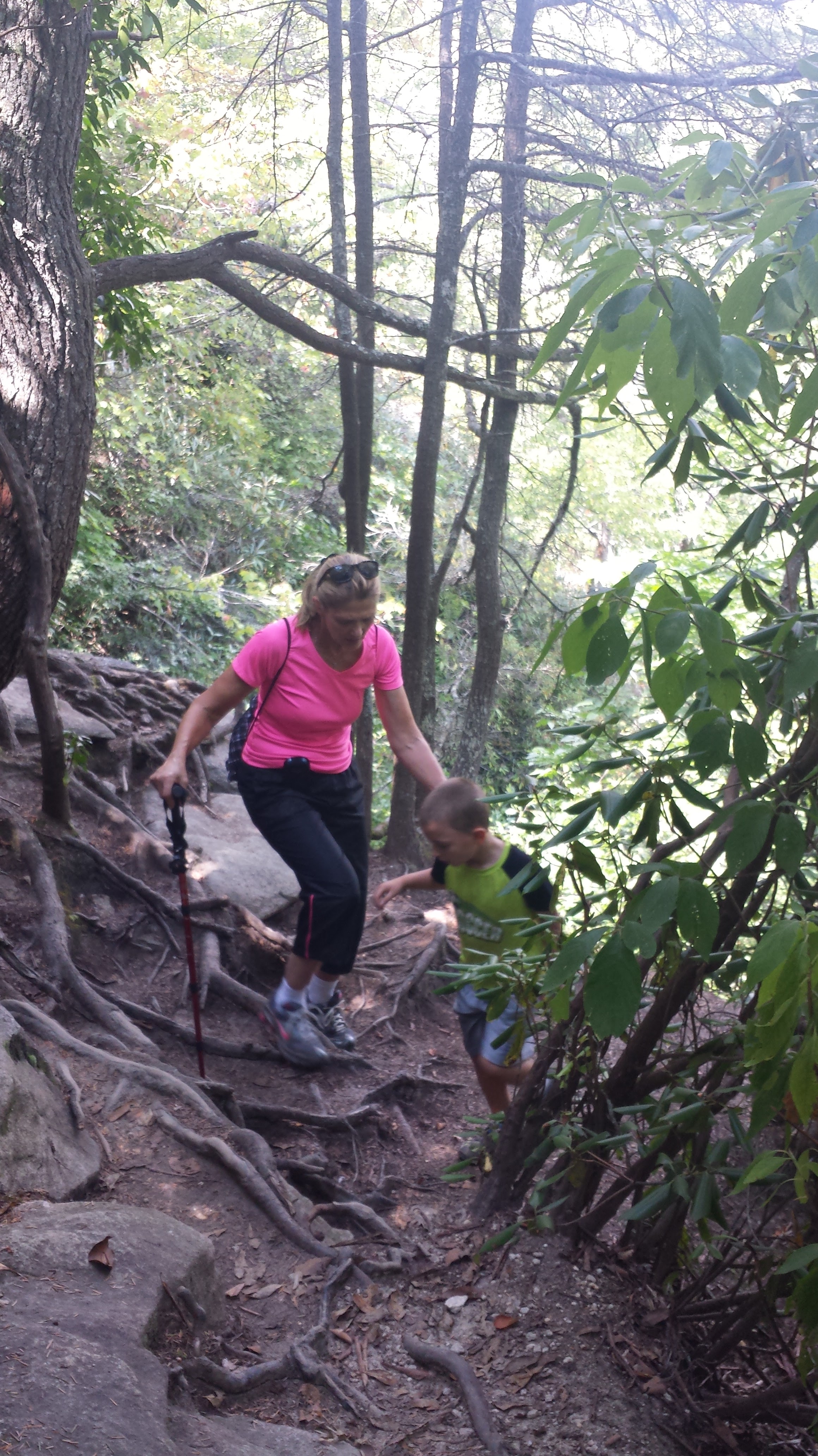 This will continue until again closer to the top (about 10 minutes from the top) it actually will flatten out as you pass the summit of the mountain and go downhill. That was such a nice break on our legs! You will then reach the opening onto the rock (Upper Looking Glass Cliffs) as a bright light of the sun highlights the exit of the trail!
