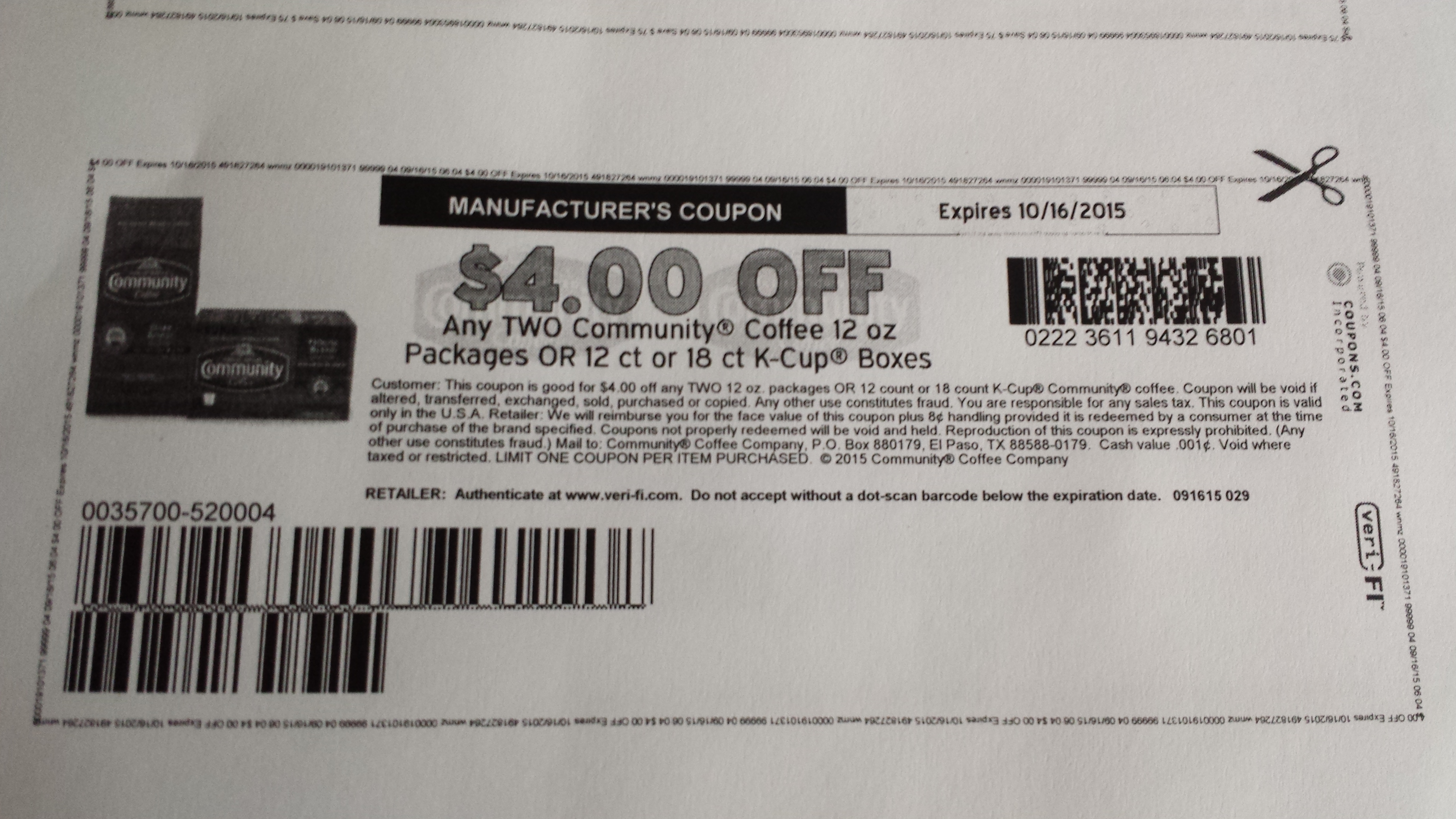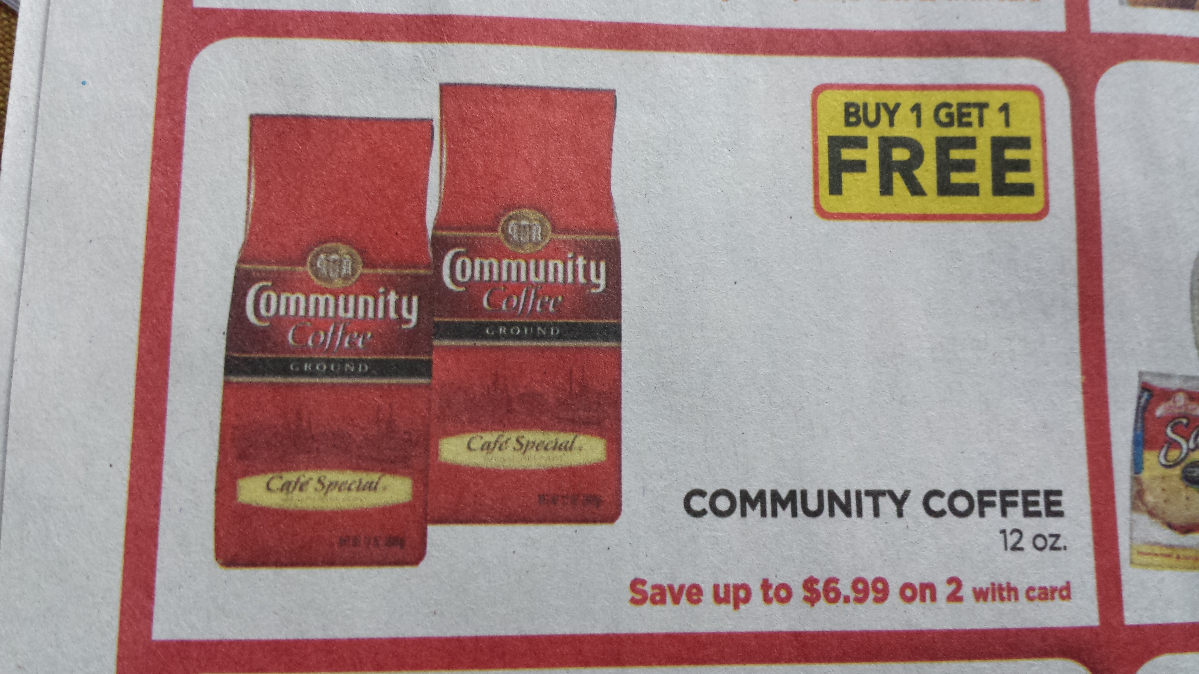 BiLo has Community Coffee B1G1 making each bag $3.50. There’s a coupon on http://www.coupons.com for $4/2 bags. That makes each bag $1.50.