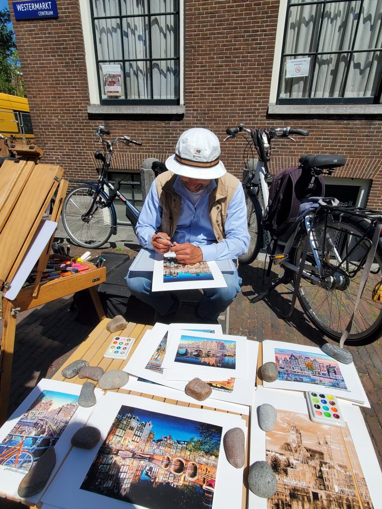 We walked a lot. We started near Central station in Amsterdam.We stopped at a local bakery…the ham and cheese croissant was huge. I bought that and a coffee for only 5 euros. We walked up and down streets to see the canals.We stopped by a painter’s stand and bought some amazing fine detail amsterdam art.
